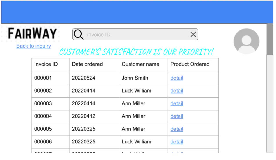 A customer is a person who purchases products that are marketed at FairWay. The system should allow the user to store the following information: their first and last name, unique ID, phone number, email, address, and an invoice that contains a list of purchased products. The system should also allow the customer to select products that they would like to buy and complete transactions.